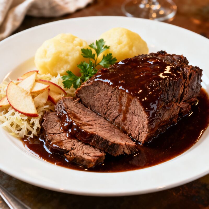 Dieser Sauerbraten mit Apfelkraut ist ein klassisches Schmorgericht, das durch seine lange Beizzeit besonders aromatisch und zart wird. Die Kombination aus würziger Essigmarinade und fruchtiger Süße des Apfelkrauts sorgt für eine ausgewogene Balance von Säure und Süße, wie sie für rheinische Sauerbraten-Varianten typisch ist.