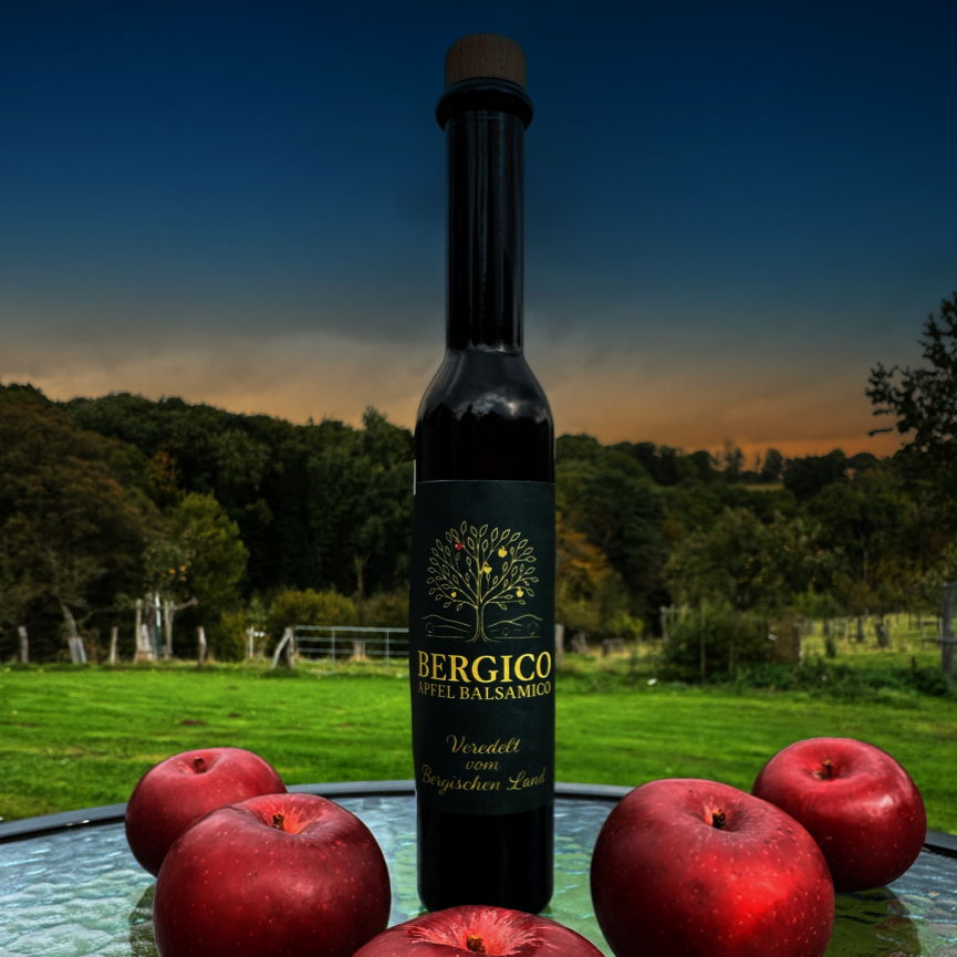 Aus den sonnenverwöhnten Streuobstwiesen des Bergischen Landes entsteht eine besondere Kostbarkeit: BERGICO – Apfel Balsamico. Mit Liebe und Sorgfalt hergestellt, verbindet er die fruchtige Frische reifer Äpfel mit der feinen Tiefe eines edlen Balsamicos.